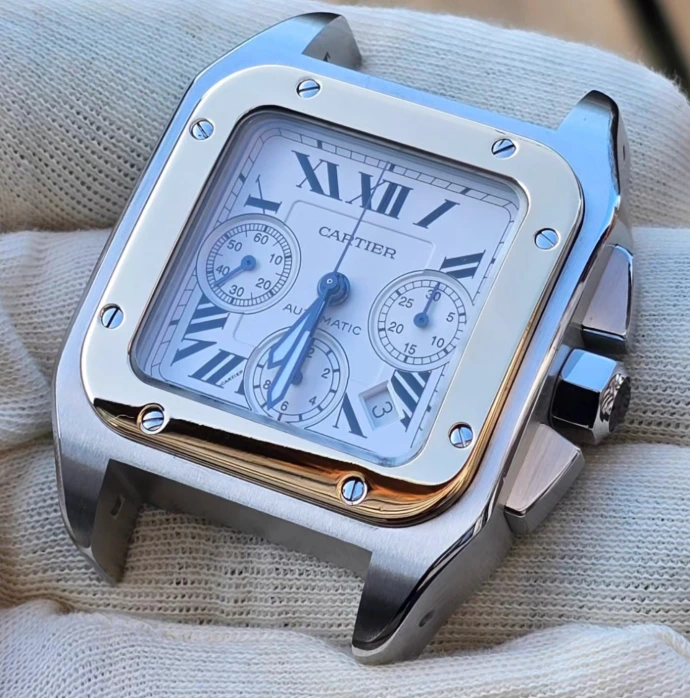 Ici, une Omega Speedmaster Mark II des années 70 poli à l'atelier, qui représente un beau challenge car de nombreuses finitions sont présentes sur un même boîtier :